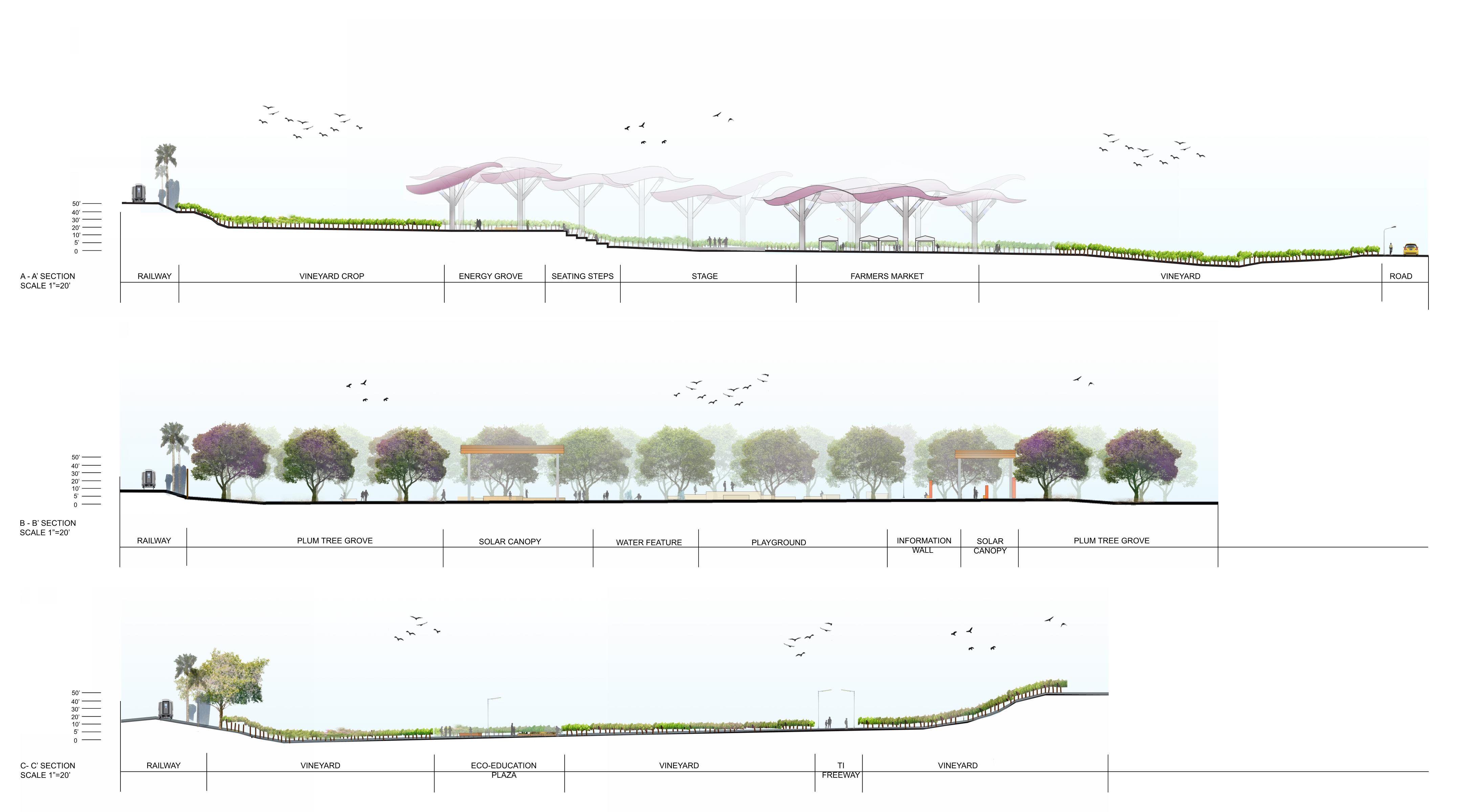 This site is located in the long beach near Terminal Freeway. The main vision of the project is to turned the freeway from barrier to benefit. The proposed plan will change the freeway to an urban agriculture. The horticultural based landscape have orchard, vineyard, community gardens help provide fresh food for the community and in the meanwhile help improve community economy. The solar panels in the site provide sustainable, environmentally friendly energy support in the site.