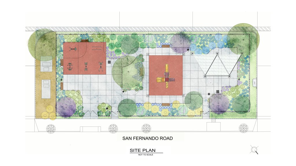 San Fernando Road park represents a broader effort by the city of Los Angeles to increase the number of recreation areas in historically park-poor neighborhoods, like Sylmar. The park is 10,500 square feet. Surrounded by brand-new single-family homes, the park is concrete and soft rubber, with a border of woodchips and drought-tolerant landscaping—dotted by a handful of small trees and patches of grass. It has a small play area for children, picnic tables, benches, and some fitness equipment.